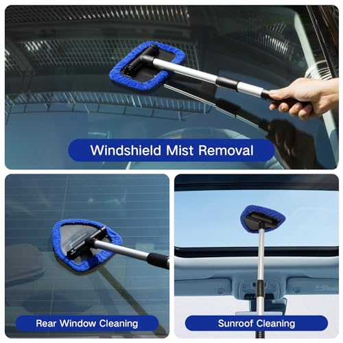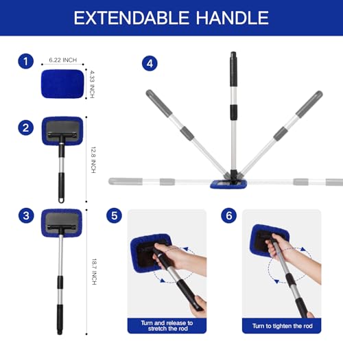 11pcs Windshield Cleaner Tool, Car Window Cleaning Wash Kit with 6 Reusable Microfiber Pads 2 Spray Bottles and Extendable Handles Auto Glass Wiper Kit, Blue