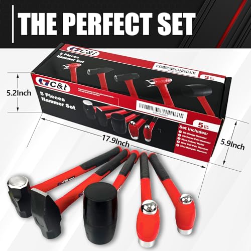 C&T 5-Piece Hammer Set, 16oz Ball Peen Hammer | 32oz Ball Peen Hammer | 32oz Rubber Mallet | 3lb Sledge Hammer | 3lb Cross Peen, Fiberglass Handle & Mallet Set