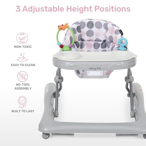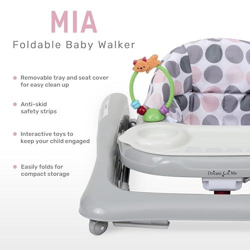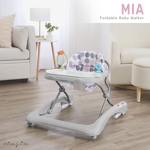 Dream On Me Mia Foldable Baby Walker in Grey, Foldable Walker with Adjustable Heights, Removable, Machine Washable High-Back Padded Seat, Suitable for 6-12 Months