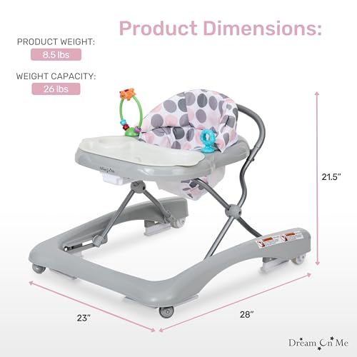 Introducing the Dream On Me Mia Foldable Baby 2-in-1 Walker and Walk-Behind Function– your little one’s ticket to adventure and discovery! This wonderful walker is designed to keep your baby entertained and safe as they explore their world. With its wide and comfy tray, mealtime becomes a breeze, and when it’s time to clean up, simply detach the transparent, dishwasher-safe tray for effortless cleaning. Equipped with interactive toys and 3-position adjustable heights, the Mia Foldable Baby Walker makes for fun playtime. With a removable, machine washable high-back padded seat, safety & convenience checks the box. Rest easy knowing your baby is fully supported, as this wonderful walker comes with 4 anti-skid footwalls. And the best part? When playtime is over, this walker folds up effortlessly for compact storage. Available in trendy Grey, Pink, and Teal Gray! Product dimensions are 20.8” L x 23.6” W x 27.9” H, with a weight of 10.1 Lbs. This product has a maximum weight capacity of 26 Lbs and is suitable for babies from 6 months of age.