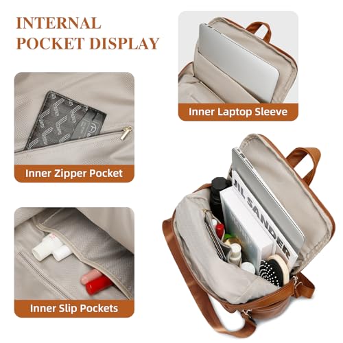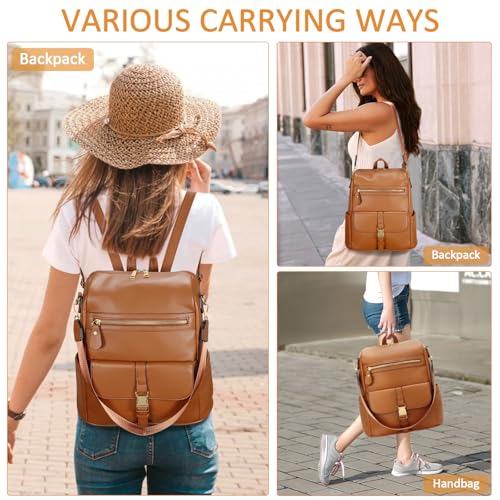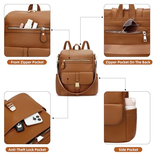 KKXIU Backpack Purse for Women – Multi-pocket Leather backpack for Travel, Work & School with Anti-Theft Lock Pocket, Luggage Strap & Water Bottle Pockets – 13x14x5.2 Inch, 1.67lb (Brown)
