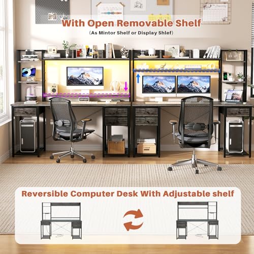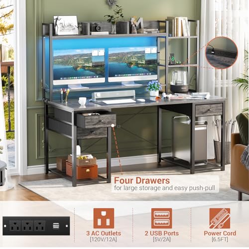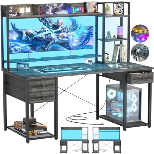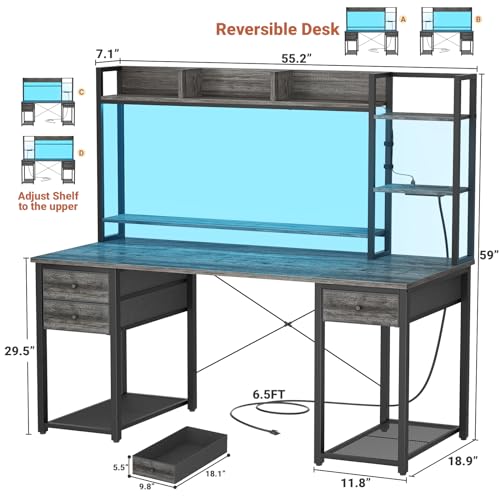 Aheaplus Desk with LED and Outlets, Gaming Desks with Hutch, 55.2” Computer Desk with Drawers, Reversible Office Desk with Storage Bookshelf Large Workstation with Shelf, Desk for Home, Black Oak