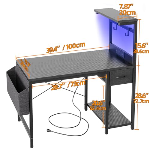 TIQLAB Gaming Desk 40 inch with Power Outlet and LED Light, Computer Desk with Reversible Shelves and Storage Drawer, Small PC Desk for Home Office Table with Bag, Carbon Fiber Black