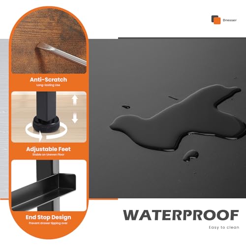 Studry & Durable: The nightstand has a strong steel frame and water-resistant wooden top to ensure a long service time, easy-pull plastic handles to make opening and closing smooth, and 4 adjustable plastic feet to protect the floor from scratches.