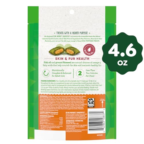 Feline Greenies Smartbites Skin & Fur Treats for Cats are the perfect treat to keep your cat purring. Designed by veterinarians with fish oil that provides a rich, natural source of omega-3 fatty acids, as well as ground flaxseed, these healthy cat treats help maintain healthy skin and fur. These delicious vet recommended cat snacks have added vitamins, minerals, and other nutrients for a nutritionally complete and balanced snack. Plus, the irresistible little treats come in a delectable chicken flavor and have a delightful crunchy and soft dual-texture. These Feline Greenies are tasty skin and fur treats your adult cat will love. They’re also the perfect sized treats for cat toys… try placing a few inside a treat dispenser toy and watch your cat chase and swat away. Share with all the Felines in your life and give them Feline Greenies Smartbites Skin & Fur Treats for healthy, happy purrs of joy.