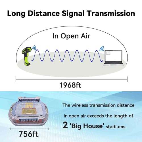 【Exceptional Signal Range】 The Alacrity 433MHz RF wireless barcode scanner stands out with its long-distance transmission capabilities. In an unobstructed environment, it can transmit signals up to an impressive 1968 feet (600 meters), and even in environments with obstacles, it reaches a substantial 656 feet (200 meters). This extended range makes it a perfect fit for large warehouses where signal coverage is crucial.